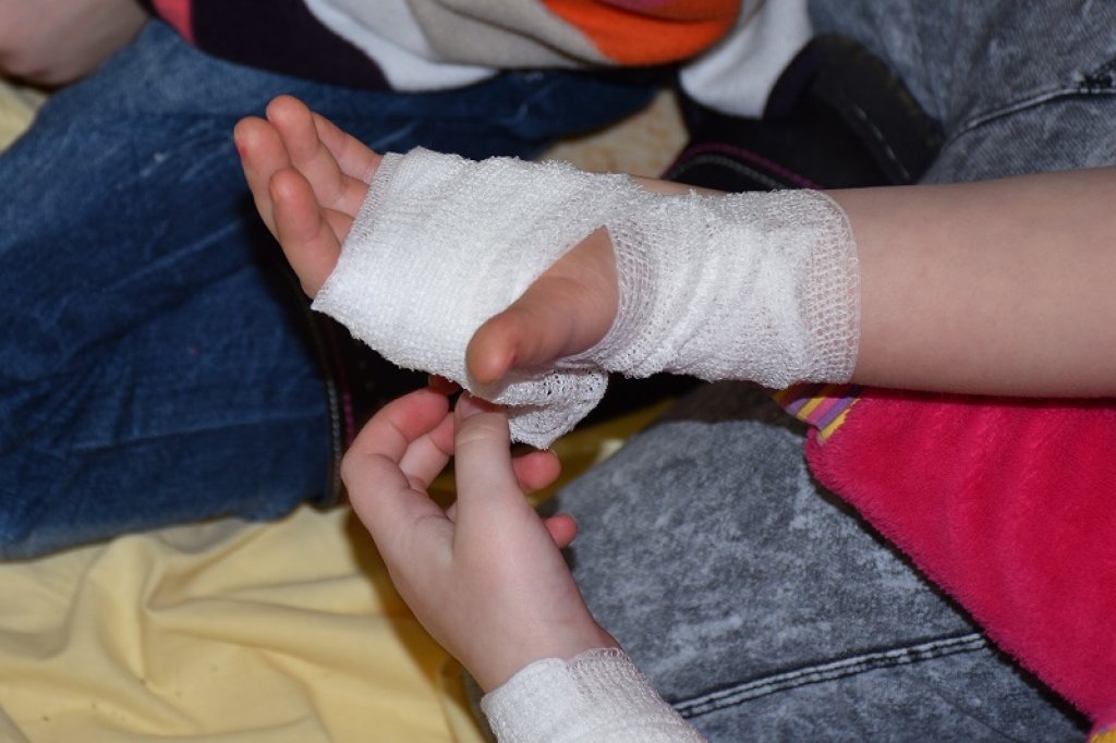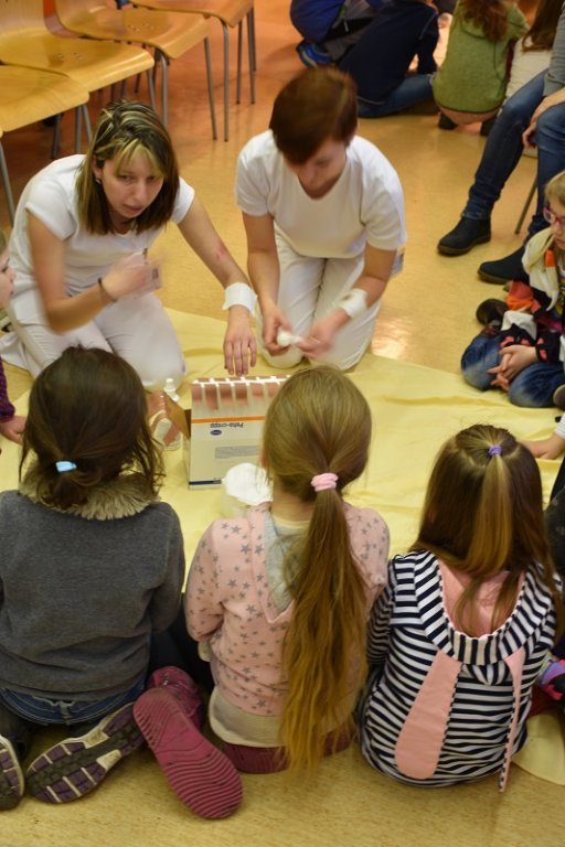 V druhé části programu je studenti praktickou ukázkou seznámili se základními postupy jak ošetřit a obvázat odřenou ruku, koleno. Překvapením pro ně byla ukázka sanitního vozu Fakulty zdravotnických studií, kde si mohli vyzkoušet nepřímou srdeční masáž na figuríně.